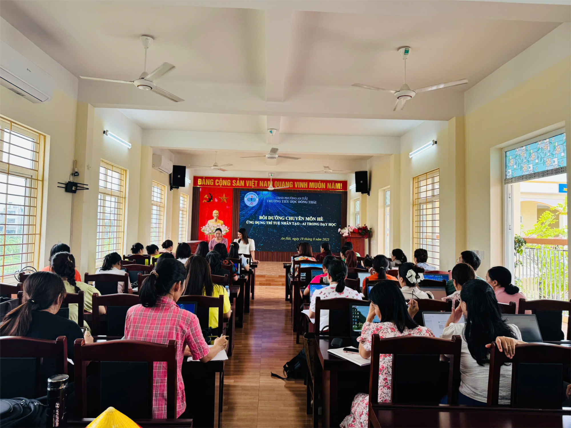 Nhằm nâng cao chất lượng giáo dục và bắt kịp xu hướng công nghệ 4.0, chiều ngày 19/8/2025, trường Tiểu học Đồng Thái đã tổ chức thành công buổi Bồi dưỡng chuyên môn toàn trường với chủ đề "Tập huấn ứng dụng AI trong dạy và học". Buổi tập huấn diễn ra trong không khí sôi nổi và hào hứng với sự tham gia của toàn thể đội ngũ giáo viên nhà trường. Với tinh thần học hỏi nghiêm túc, các thầy cô đã tích cực tiếp thu kiến thức và thực hành các nội dung vô cùng bổ ích, thiết thực: