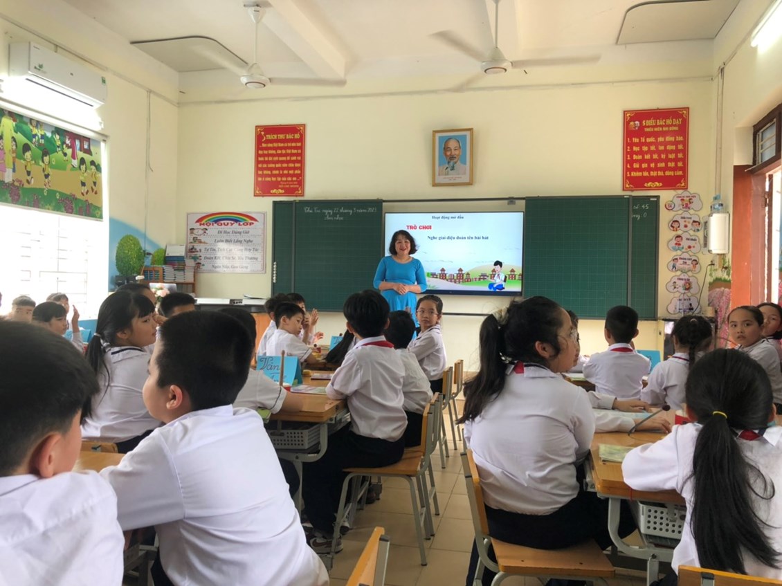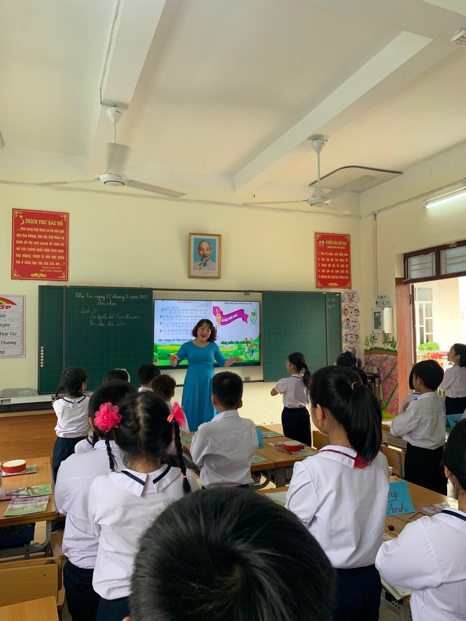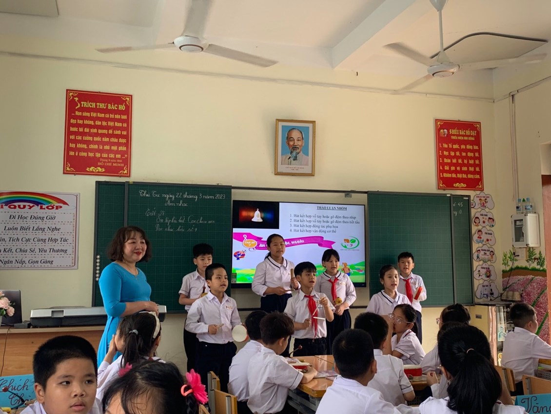 Cô giáo đã vận dụng linh hoạt, sáng tạo các phương pháp, hình thức tổ chức dạy học giúp học sinh tự khám phá, chiếm lĩnh và nắm vững kiến thức, qua đó phát huy tính chủ động, tích cực của mỗi cá nhân. Học sinh được tham gia các hoạt động học tập phong phú, được sử dụng các nhạc cụ âm nhạc đa dạng, tự tin, mạnh dạn bày tỏ ý kiến, tích cực hợp tác với các bạn. Bằng những hình ảnh, giai điệu, lời ca, cô đã khéo léo liên hệ thực tế, giáo dục cho HS tình yêu âm nhạc, biết yêu quý và bảo vệ thiên nhiên.