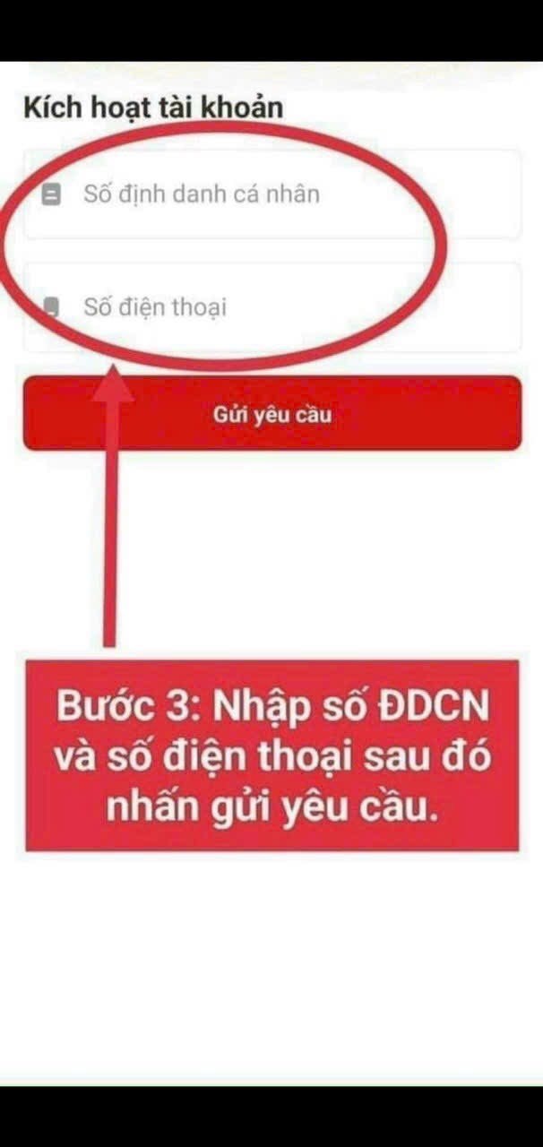 Sau khi công dân đăng ký tài khoản mức 1 xong, người dân kích hoạt bằng các cách chọn “Kích hoạt tài khoản định danh điện tử” trên màn hình giới thiệu ứng dụng VNeID hoặc chọn “Kích hoạt” tại màn hình Đăng nhập - NSD nhập số định danh cá nhân và số điện thoại và ấn “Gửi yêu cầu” thì hệ thống sẽ kiểm tra mức độ tài khoản - Nếu là tài khoản ứng dụng VNeID sẽ hiển thị thông báo “tài khoản của bạn chưa được định danh điện tử”. Nếu là tài khoản mức 1/mức 2 nhưng đã được kích hoạt sẽ hiển thị thông báo “Tài khoản của bạn đã thực hiện kích hoạt”. Nếu là tài khoản mức 1/mức 2 chưa kích hoạt, thì sẽ kiểm tra thiết bị đang dùng để kích hoạt.