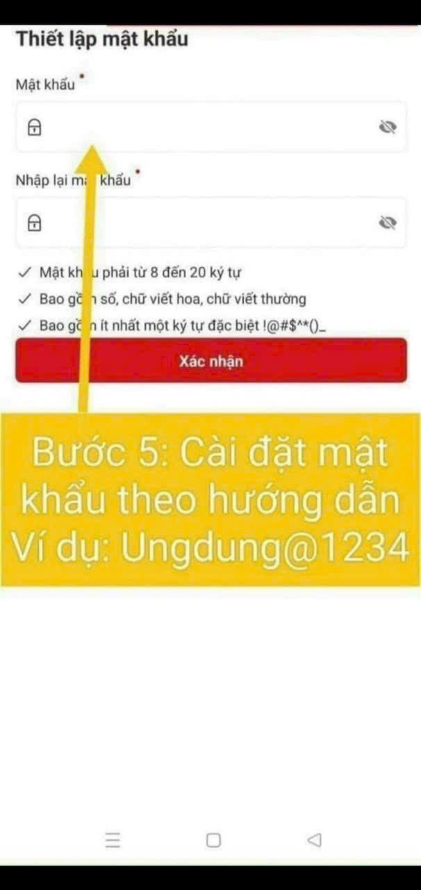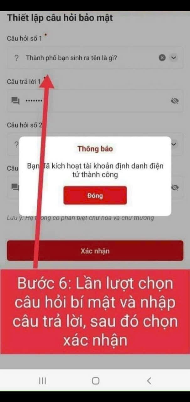 Thiết bị đang dùng để kích hoạt không được gắn với tài khoản mức 1/ mức 2 nào sẽ hiển thị thông báo kích hoạt tài khoản. Hoặc thiết bị đang dùng để kích hoạt đang được kích hoạt để sử dụng với một tài khoản mức 1/ mức 2 khác sẽ hiển thị thông báo kích hoạt tài khoản trên thiết bị khác - Nhập mã kích hoạt hệ thống gửi về SMS, người dân nhập đúng mã OTP được gửi về số điện thoại đăng ký - Thiết lập mật khẩu (Bước này chỉ áp dụng cho các trường hợp công dân chưa có tài khoản trước khi được phê duyệt) - Thiết lập passcode: người dân thiết lập passcode gồm 6 chữ số để sử dụng cho các tiện ích trong ứng dụng - Thiết lập câu hỏi bảo mật: người dân thiết lập 2 câu hỏi và trả lời bất kỳ trong list câu hỏi bảo mật để thực hiện bảo mật tài khoản.