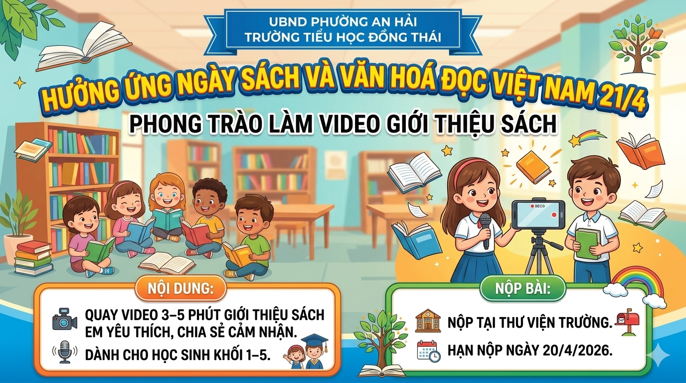 Hưởng ứng Ngày Sách và Văn hóa đọc Việt Nam (21/4), Trường Tiểu học Đồng Thái đã triển khai nhiều hoạt động thiết thực và ý nghĩa nhằm khơi dậy niềm đam mê đọc sách, xây dựng thói quen đọc sách cho học sinh, góp phần lan tỏa văn hóa đọc trong nhà trường.
