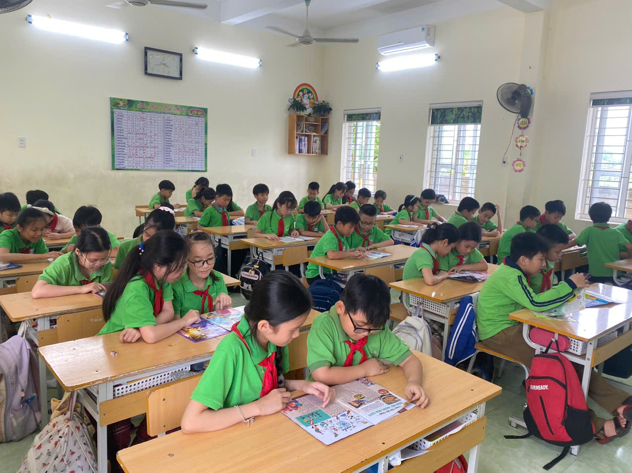 Ngay từ đầu tháng 4, Cô Vũ Thị Thêm - giáo viên chủ nhiệm lớp đã phát động tuần lễ đọc sách với chủ đề “Sách – người bạn thân thiết”. Mỗi bạn học sinh đều mang đến lớp những cuốn sách yêu thích để chia sẻ và giới thiệu cho các bạn khác. Nhờ đó, chúng em không chỉ có thêm sách hay để đọc mà còn hiểu hơn về sở thích đọc của nhau. Góc "Tủ sách lớp em" được trang trí sinh động với nhiều đầu sách phong phú từ truyện cổ tích, truyện tranh lịch sử đến sách khoa học, kỹ năng sống. Mỗi ngày, sau giờ học, các em đều được dành 15 phút để đọc sách trong không gian yên tĩnh, ấm áp của lớp học.