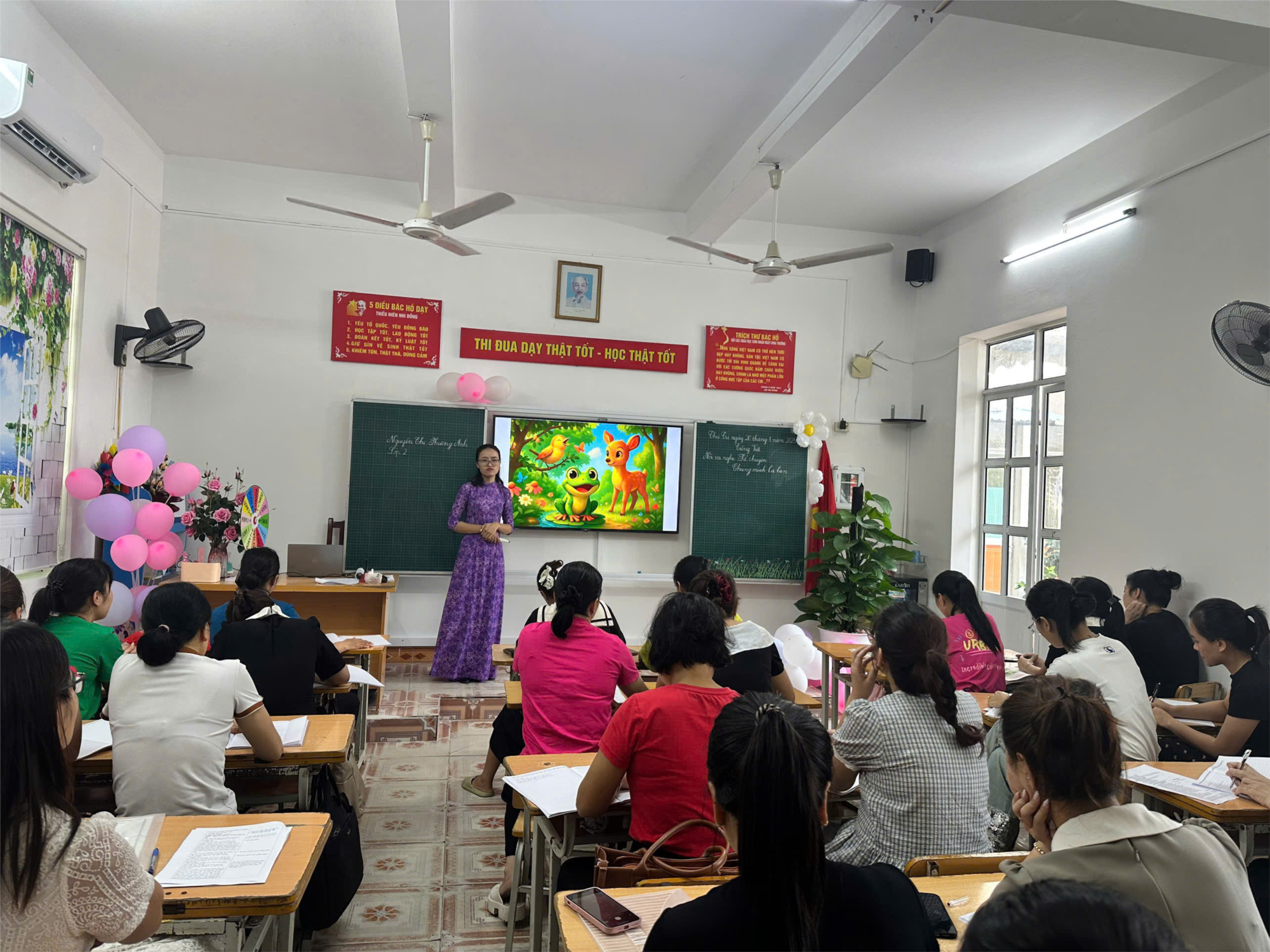 Cô giáo Nguyễn Thị Phương Anh thể hiện tiết Tiếng Việt với hoạt động Nói và nghe – Kể chuyện: “Chúng mình là bạn”. Ngay từ phần khởi động, học sinh đã được cuốn hút bởi giai điệu sôi động của bài hát “Tình bạn diệu kỳ”. Câu chuyện về tình bạn giữa Ếch ộp, Sơn ca và Nai vàng được truyền tải một cách sinh động qua lời kể kết hợp video AI minh họa sinh động. Đặc biệt, các kĩ thuật dạy học tích cực như thảo luận nhóm, trò chơi “Vòng quay may mắn” đã giúp học sinh hứng thú tham gia, tự tin thể hiện khả năng kể chuyện. Qua các hoạt động, các em không chỉ nhớ cốt truyện mà còn rút ra bài học quý giá về tình bạn: mỗi người đều có thế mạnh riêng, cần biết tôn trọng sự khác biệt, đoàn kết và gắn bó với nhau.