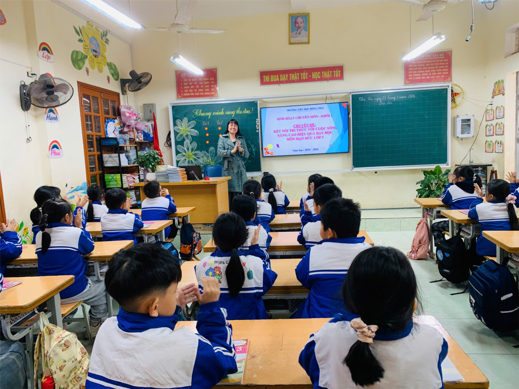 Ngày 23 tháng 1 năm 2026, khối 3 trường Tiểu học Đồng Thái đã tổ chức buổi sinh hoạt chuyên môn với chuyên đề “Kết nối tri thức với cuộc sống nâng cao hiệu quả dạy học môn Đạo đức lớp 3”. Chúng tôi đã cùng nhau nghiên cứu bài, thảo luận và nhất trí chọn bài “Tích cực hoàn thành nhiệm vụ (Tiết 3)” trong môn Đạo đức để minh họa cho nội dung chuyên đề. Tiết dạy được cô giáo Lê Thị May thực hiện vào ngày 23/1/2026 tại lớp 3C4.